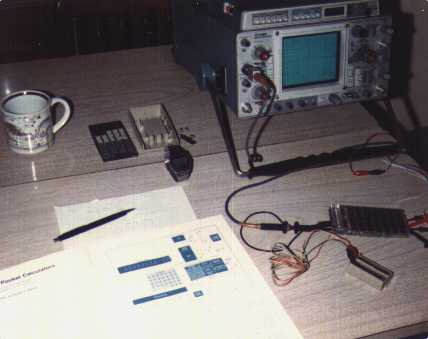 Trying to peek (with poor results) into my HP25. Note the Tektronix 465 oscilloscope with a DM 44 multimeter optional feature in top.