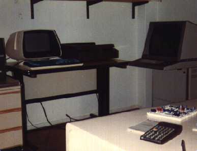 My HP 41C helped in the design of a custom interface prototype (white breadboard). A Data General Dasher terminal, a plotter, and a Tektronix graphics terminal (with storage CRT) are also shown (left to right).