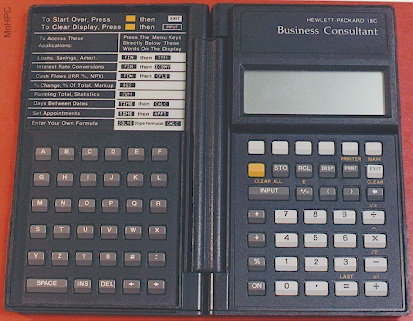 The HP-18C was a business calculator with a new clamshell (folding) design and a dedicated alphanumeric keyboard. It was HP's first algebraic pocket calculator. (HP previously used algebraic logic on desktop calculators, portable and desktop computers and the HP-01 calculator watch.) Besides the basic business features of time value of money, cash flows etc., it had a clock with appointments, and an equation solver. It had 4 numbered registers, plus named lists.
