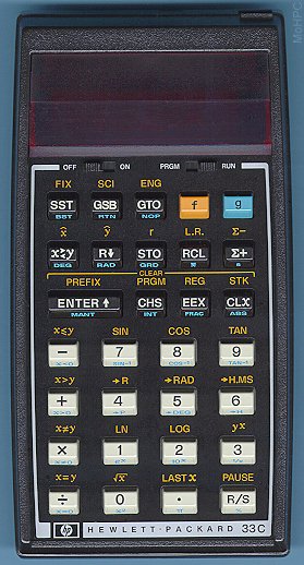 The HP-33E and HP-33C were the basic scientific programmable members of the 30 series. The "E" model had conventional memory which lost its contents when power was turned off. The "C" model provided continuous memory. (After this series, continuous memory was considered basic functionality. The curator has, on several occasions had to explain to more recent calculator users that loss of data on power off was normal for older calculators.)