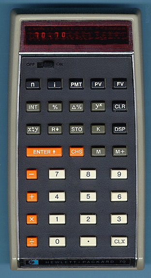 The HP-70 was a lower end business calculator designed to complement the HP-80. It retained the time value of money solver of its more expensive sibling but dropped, bond price and yield, sum of digits depreciation, summation and averaging, trend lines, day and date arithmetic etc. Like the HP-35, it was one of the few HPs without a shift key.
