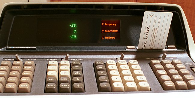 Above the keyboard to the left was the 3.25" x 4.75" green CRT display which showed the entire stack. Each register was labeled (x keyboard, y accumulator, z temporary) in glowing green on the HP 9100A or orange on the B. A light near the CRT lit when an illegal operation was performed. Below the keyboard on the front was a pull-out quick reference card.