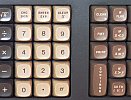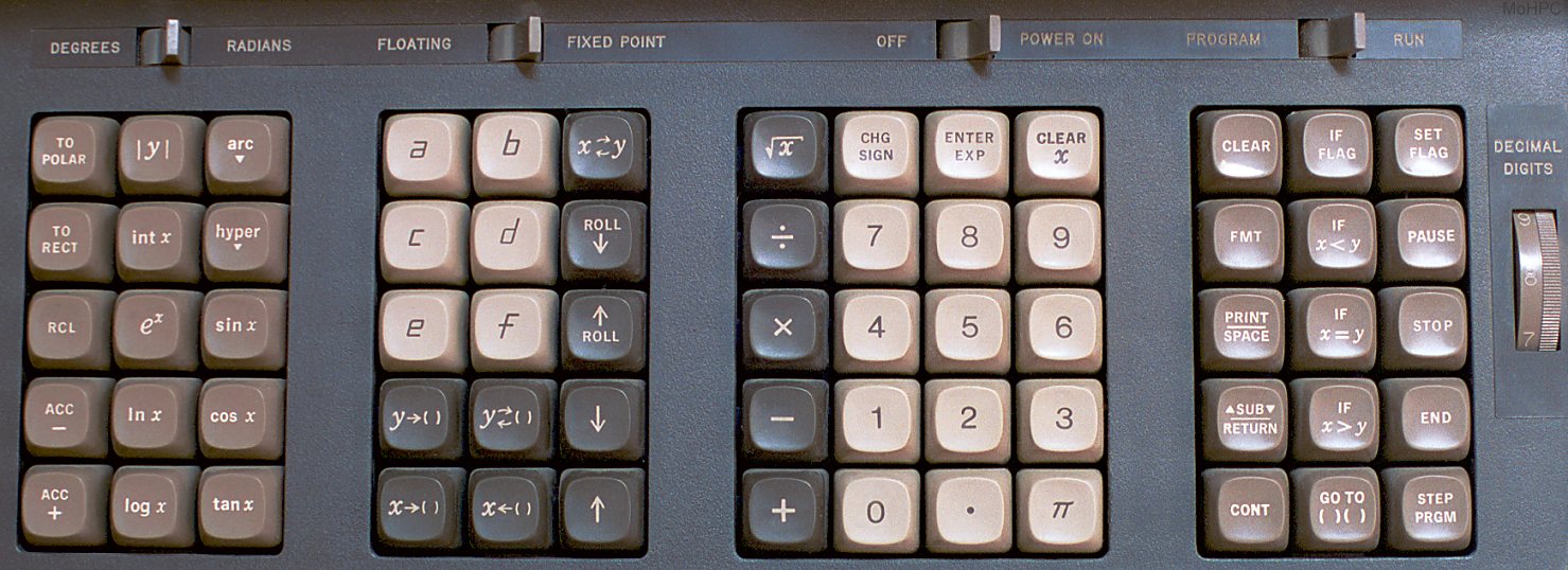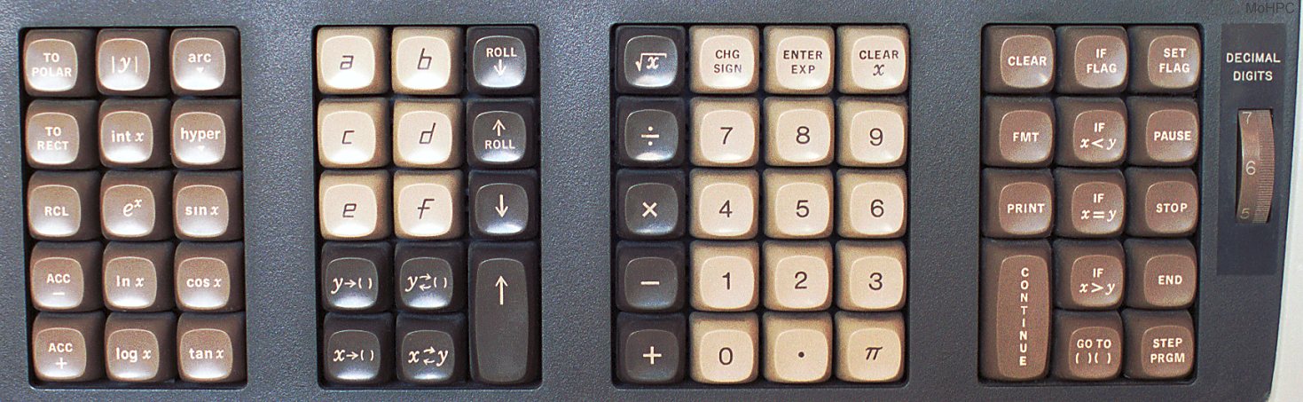 The calculator's front was dominated by a large keyboard which had excellent feel and the keys were ivory, beige and dark brown. The keys were separated into to four groups: scientific functions, stack and memory functions, digits and basic math, and programming functions. To the right of the keys was a thumb wheel for selecting the number of digits displayed after the decimal point. An FMT (format) key was included and its action was dictated by the type of peripheral attached to the calculator. Above the keys were toggle switches for degrees/radians, floating/fixed point, on/off and program/run.