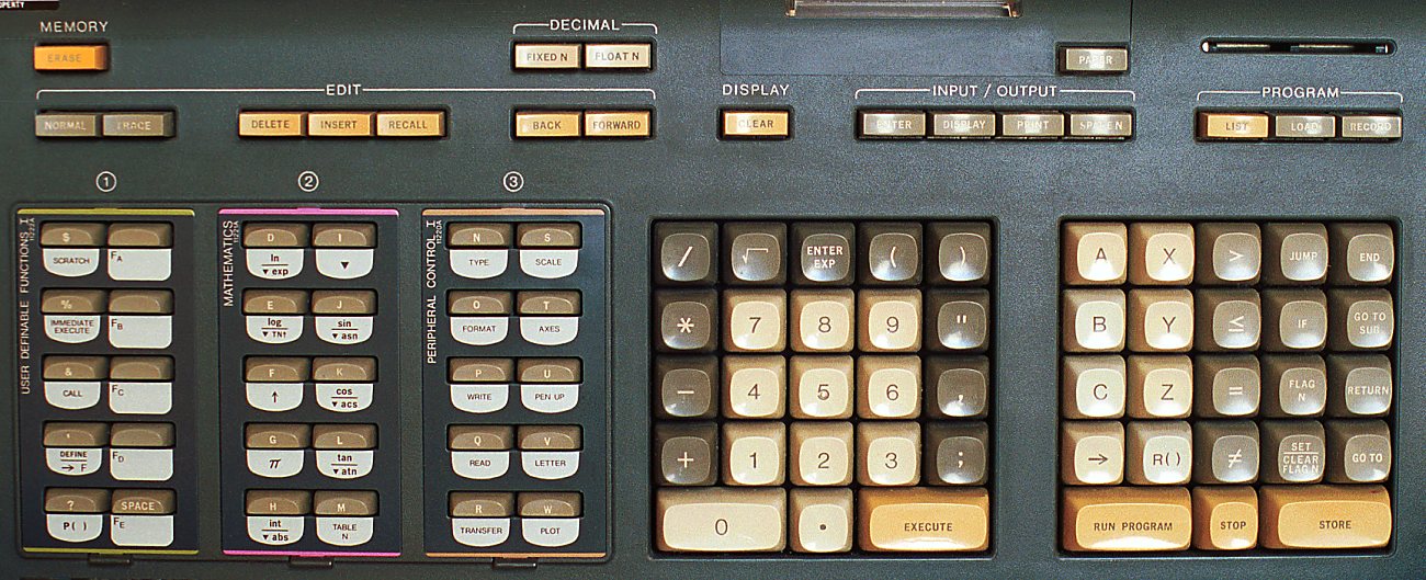 The HP 9820A (AKA the 9800 series model 20) was HP's third calculator. It made use of many of the same parts used to make the HP 9810. In fact a number of PC boards were interchangeable between the two. There was, however, a major distinction: The HP 9820A was HP's first algebraic calculator. It was a fully algebraic calculator with parentheses, precedence and even implied multiplication. (e.g. 2AB meant 2 times A times B.) The calculator displayed the expression as entered on a single line alphanumeric LED display (which showed 16 characters and scrolled as needed) and evaluated it when the EXECUTE key was pressed.