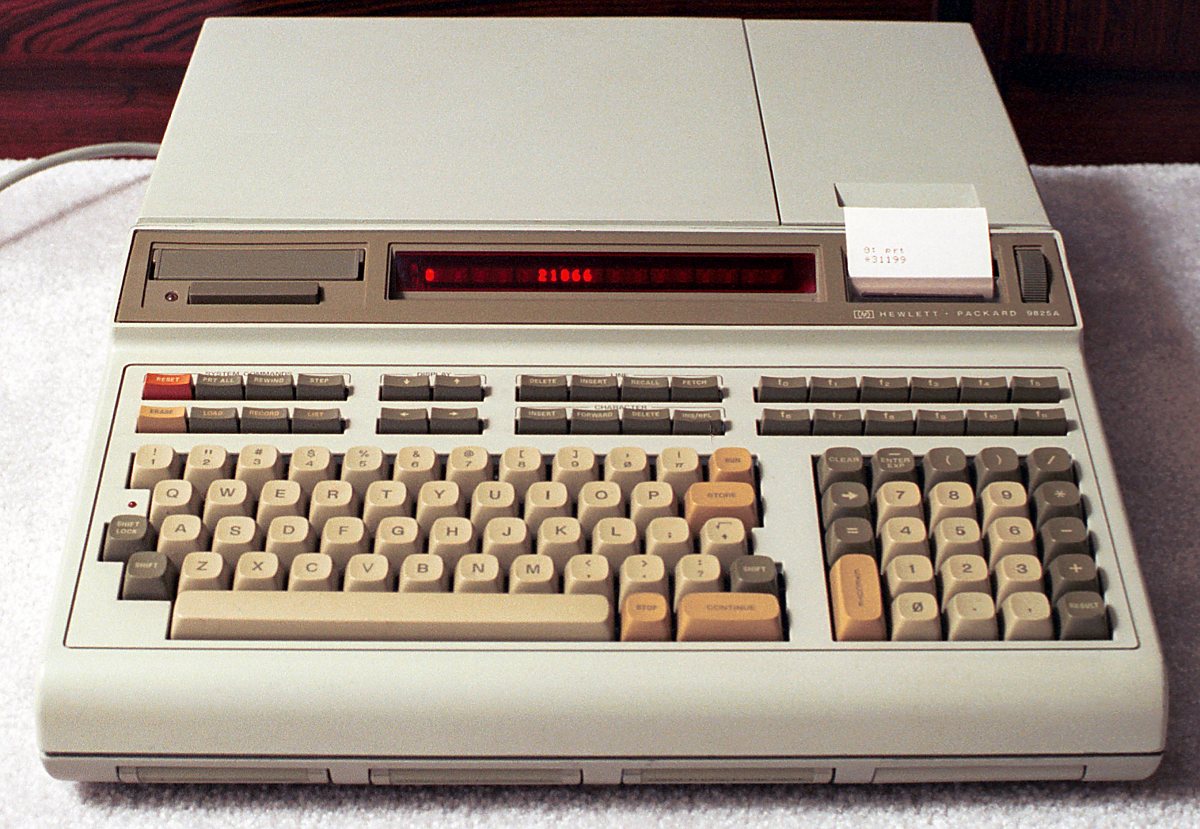 The HP 9825A (AKA the 9800 series model 25) was a powerful fully algebraic desktop calculator. It replaced the HP 9820A and made a number of improvements including a full QWERTY keyboard (plus special function keys), a 32 (instead of 16) character display, and major extensions to the programming language. This new extended language was called HPL.