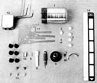 Fig. 2 shows the card-reader parts disassembled. (HP-65 card reader parts: 1. Motor 2. Idler roller 3. Switch activation balls 4. Thrust ball bearing 5. Card side loading springs 6. Rubber drive roller and helical gear 7. Worm gear 8. Drive pin 9. Coupler 10. Coupler sleeve 11. Switch contacts 12. Read1write head 13. Self-tapping switch adjustment screws 14. Magnetic card, 7.1 cm by 1 cm.)