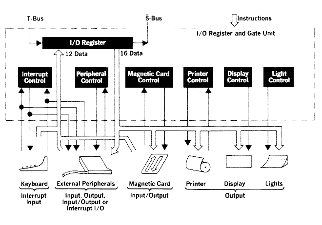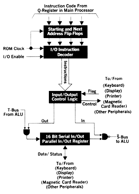 The I/O register's 16 parallel outputs provide the source for an output information bus structure which is common to all connecting peripherals. Parallel input information is received via an input information bus structure terminated by the twelve least-significant parallel inputs of the I/O register. Input information may be loaded into the I/O register by interrupt request or upon demand from the calculator.