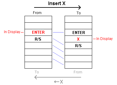 The following diagram when read from left to right shows the insertion of a multiply after the ENTER. Start with the display showing the ENTER instruction. The x is inserted after the ENTER and the display moves down to show it. Reading right to left, with the display showing the x, pressing the <-- key, deletes the x, and leaves the display on the line above (ENTER.)