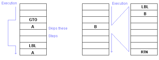 The calculator uses label addressing. Labels available are the upper case letters A through E and the digits 0 through 9. Only labels A-E could be directly executed from the keyboard. The numeric labels are for use internal to the programs. The calculator always searches downward through program memory from the current location. If there are multiple copies of a label it will execute the first one it finds. After it gets to the end of memory it resumes searching from the beginning.