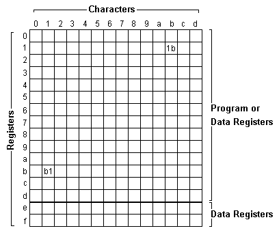 The HP 9100A has 16 registers of core memory. 14 of these registers (0-d) can be used to hold 14 program steps each which allows up to a maximum of 196 steps with two storage registers e and f. The memory layout is shown below: