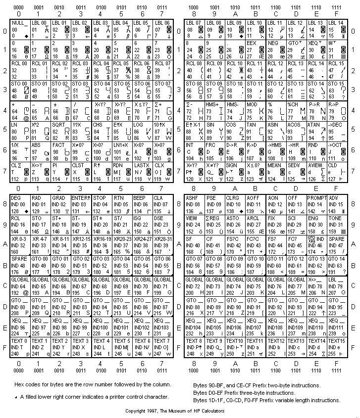 The characters for the byte codes are shown in the right side of each cell in the graphical byte code table. Note that some characters print differently than they display--another result of HP not expecting users to discover this stuff.