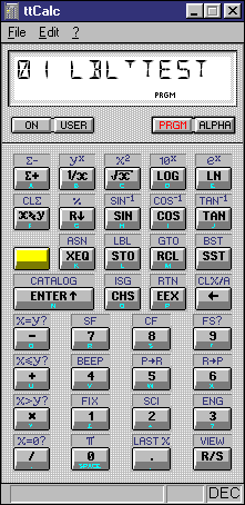 Ttcalc is a public domain programmable calculator for Microsoft Windows written by Stefan Seiwerth that is modeled after the HP-41C series of calculators. Download the program, unzip and run ttcalce.exe for the English version or ttcalc.exe for the German version. (The help file for either version is in German.) The Zip file is approximately 524K. A 10K screen shot is also available.