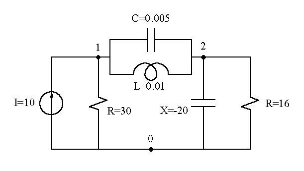 The circuit has to be specified in an ASCII file, and stored in the extended memory of the calculator. The program reads this file and prepares a complex matrix. This matrix is solved by the PVT program of the Math Module used as subroutine. Finally the program shows a complex vector with the results.