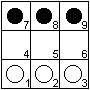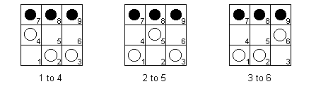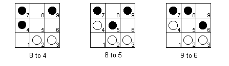 Black's three possible responses to white's 1.4 move are 8 to 4, 8 to 5, and 9 to 6.