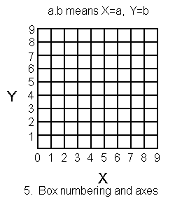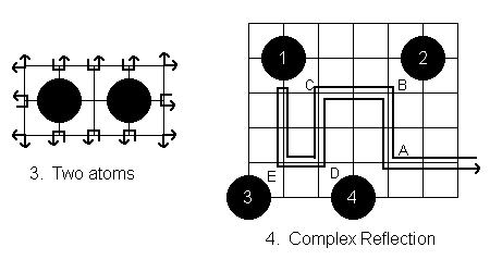N atoms are randomly placed in a black box with dimensions l0x10. No atom can be on the edge of the box. By firing particles into the box from the edges, and noting their exit locations, you attempt to find the atom positions. For a single atom, the scatters and reflections are as shown in Figure 1. Multiple atom scatters are simple extensions of this diagram: See, for examples, Figures 2 and 3. Note in particular, the back reflections of Figure 3 which arise from two combined scatters. More complex scattering and reflection are shown in Figure 4 where atom 4 causes scatter A, atom 2 causes B, 1 causes C, 4 (again) causes D, 3 causes E, and atom 1 reflects the particle back along the convoluted path. The numbering of the box grid is given in Figure 5. The 5th position on the base has coordinates 5.0, the 7th on the right is 9.7, and so on.