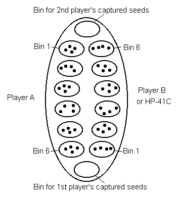 Each player in turn removes all the counters from one bin on his side and distributes them one-at-a-time into successive bins moving counterclockwise, skipping the two bins which are for storing captured counters. If the last counter drops into an opponent's hole containing one or two counters, the contents of that hole are captured and placed in the player's scoring pit. Counters in an unbroken sequence of two- and three-counter bins on the opponent's side clockwise from the captured bin are also captured. If a bin contains twelve counters or more, that bin is skipped when the counters from that bin are distributed.