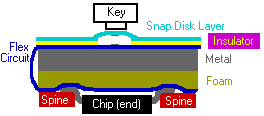 the flexible circuit key pads over metal, with the snap disk layer on top.