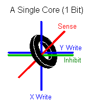 To read a word, pulses were sent down the appropriate pair of X and Y wires. The amplitude of the pulses were such that, alone, they were insufficient to change the state of a core. However, At the intersection, the coincident pulse was strong enough to set the core. If the core's polarity was changed during this operation, voltage was induced which could be detected on the sense line. (The polarity of the pulses were set to leave the core in a zero state so that a one in the core caused a pulse in the sense line.) Since the X and Y wires for each plane were connected, the values for each corresponding core were produced at the same time, each on the sense wire for that plane. (This also resulted in the cores for that word all having the same polarity - in other words that word was read and cleared.)