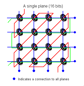 Each core was held in place with a horizontal and vertical wire. A third sense wire passed through each diagonally. (In fact a single sense wire was threaded through every core on a plane.) A fourth inhibit wire ran in parallel to each horizontal wire and was also threaded through every core in a plane. To reduce the number of addressing circuits, all the corresponding X and Y wires were connected between planes. (In other words, the processor addressed words rather than individual bits.)