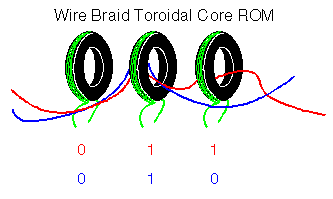 The calculator also contained 1.8k bits (64 29 bit words) of read only control memory. The control ROM used a wire braid toroidal core design which was chosen because it was extremely reliable and compact. These cores can be seen in this picture (~104K) of the control logic board. (The toroids are the row of 29 black and white objects at the bottom of the board under the metal bar.) There were 64 wires passing through this set of toroids. Each wire either passed through or around each toroid. Sending a pulse down one of the wires activated each threaded toroid which acted as a transformer and activated a transistor connected to the toroid's winding. This produced the appropriate 29 bit control word at the outputs of the transistors. (A simplified diagram showing 2 3 bit words is shown below. Each of the red and blue wires addresses a word which is output on the toroid windings.)